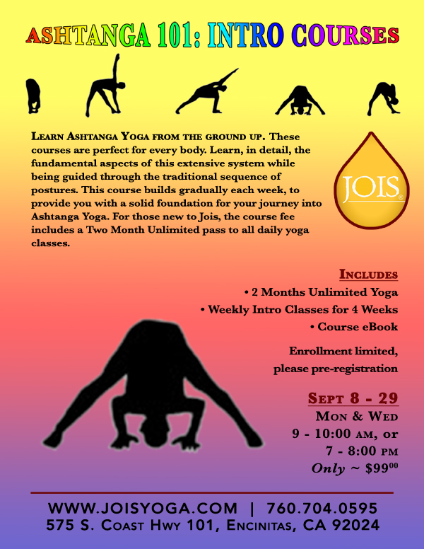 Jois ENCINITAS, CMA (Center for Martial Arts) 2122 Encinitas Boulevard, Ste 101 [Map] Encinitas, CA 92024 U.S.A. andrewh@joisyoga.com, juliet@joisyoga.com